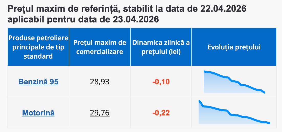 Agenția Națională pentru Reglementare în Energetică (ANRE) a afișat noile prețuri plafon pentru principalele tipuri de carburanți de tip standard. Astfel, ziua de joi, 23 aprilie, aduce o ușoară ieftinire atât pentru benzină, cât și pentru motorină.