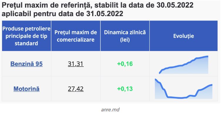 Pe 31 mai, carburanții se scumpesc din nou. Un litru de benzină va fi cu 16 bani mai scump, iar cel de motorină – cu 13. Datele au fost prezentate de Agenția Națională pentru Reglementare în Energetică (ANRE).