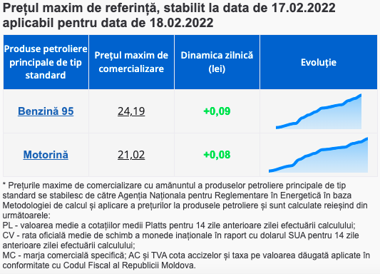 Astfel, prețul pentru un litru de benzină A95 nu trebuie să depășească 24,19 lei, iar cel pentru motorină – 21,02 lei.