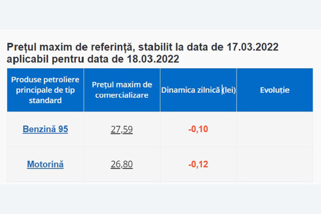 Joi, 17 martie, benzina A 95 poate fi procurată în staţiile din ţară cu maximum 27,69 lei pentru un litru, iar motorina – 26,92 lei/litru.