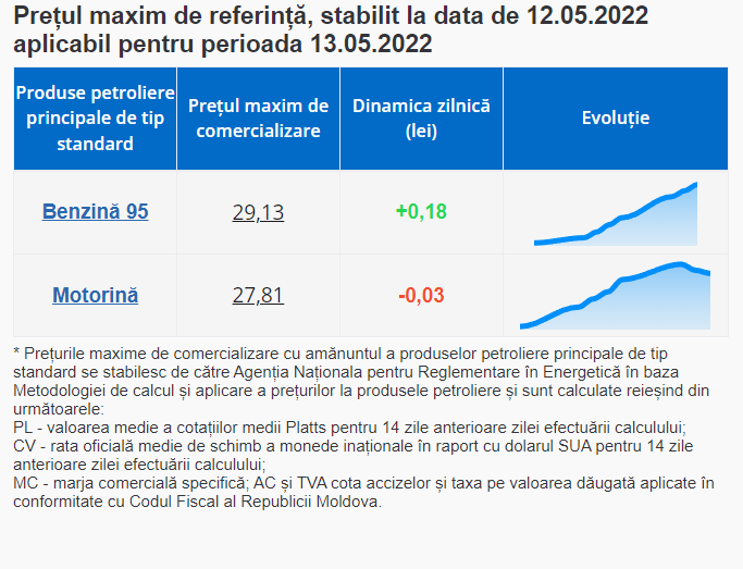 Prețurile maxime de comercializare cu amănuntul a produselor petroliere principale de tip standard se stabilesc de către Agenția Națională pentru Reglementare în Energetică în baza Metodologiei de calcul și aplicare a prețurilor la produsele petroliere. Acestea sunt afișate în fiecare zi de lucru, pentru ziua următoare.