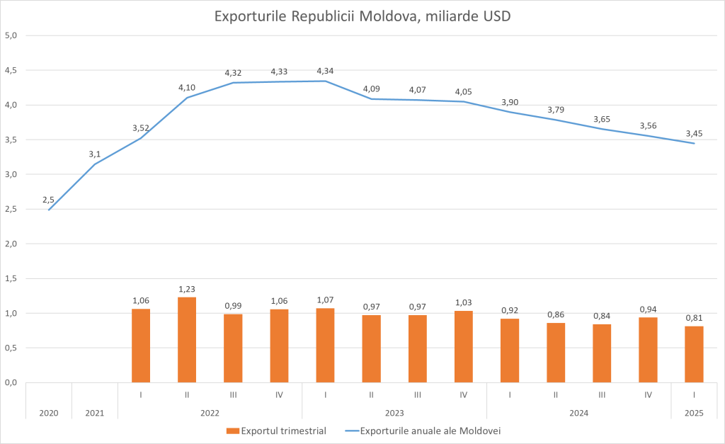 În valaore anuală exporturile Moldovei în T1/2025 au ajuns la doar 3,45 miliarde USD, cu aproape 900 milioane USD mai puțin decât în 2022, marcând o cădere continuă pe parcursul a doi ani.