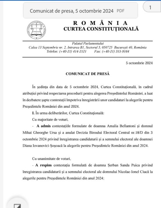 Judecătorii Curţii Constituţionale au dezbătut, sâmbătă, de la ora 17:00, mai multe contestaţii cu privire la candidaturile lui Nicolae Ciucă, Mircea Geoană, Kelemen Hunor, Ludovic Orban şi a Dianei Iovanovici-Şoşoacă, pentru alegerile prezidențiale din 24 noiembrie. Conform surselor G4Media, judecătorii CCR au anulat decizia Biroului Electoral Central privind candidatura Dianei Șoșoacă la președinția României.