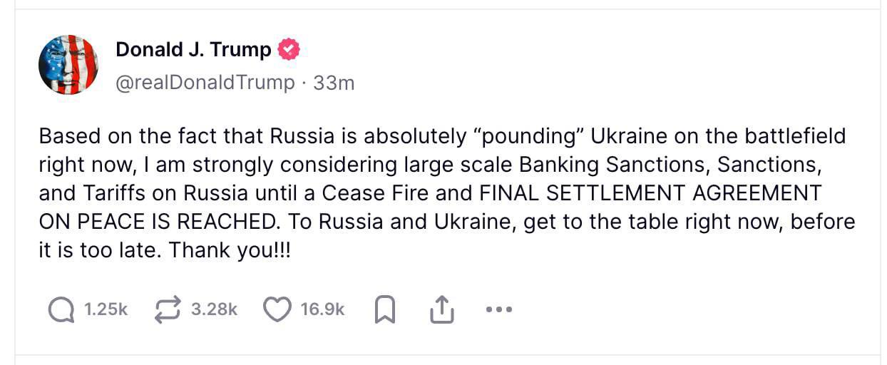 Preşedintele Statelor Unite ale Americii, Donald Trump a ameninţat Rusia cu sancţiuni economice şi aplicarea unor taxe vamale până când va fi de acord cu încetarea focului în războiul cu Ucraina şi un acord final de pace.