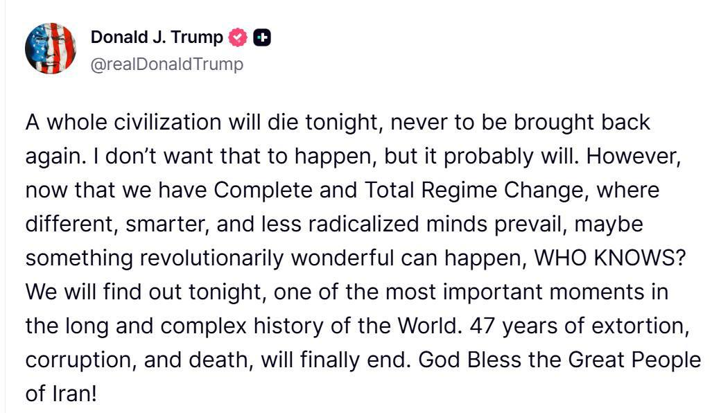 „Astăzi noaptea ar putea muri o întreagă civilizație, și nu va mai reveni niciodată. Nu vreau să se întâmple asta, dar probabil așa va fi”, a scris Trump, sugerând că Statele Unite sunt pregătite să acționeze militar.
