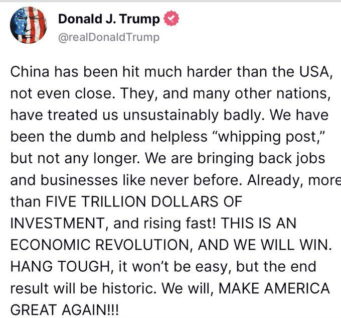 „China a fost afectată mult mai grav decât Statele Unite. Mult mai grav!”, a declarat Trump. „China, la fel ca multe alte țări, s-a purtat inacceptabil cu noi. Am fost proști și neputincioși, toată lumea își bătea joc de noi. Dar acest lucru s-a terminat.”