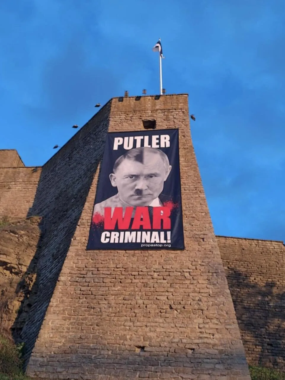Un banner uriaș care îl înfățișează pe Vladimir Putin sub forma dictatorului nazist Adolf Hitler a fost afișat pe zidul cetății medievale din orașul estonian Narva, la granița cu Rusia. Mesajul, vizibil de pe malul rusesc al râului Narva, conține inscripția „Putler — criminal de război”.