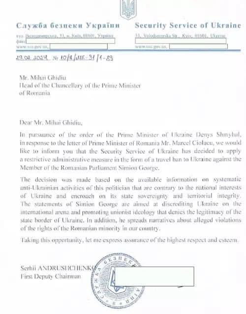 „Decizia a fost luată pe baza informațiilor disponibile cu privire la activitățile sistematice anti-ucrainene ale acestui politician care sunt contrare intereselor naționale ale Ucrainei și încalcă suveranitatea statului și integritatea teritorială a acesteia. Declarațiile lui Simion George vizează discreditarea Ucrainei pe arena internațională și promovarea ideologiei unioniste care neagă legitimitatea frontierei de stat a Ucrainei. În plus, răspândește narațiuni despre presupusele încălcări ale drepturilor minorității române în țara noastră”, se arată în documentul trimis de autoritățile ucrainene.