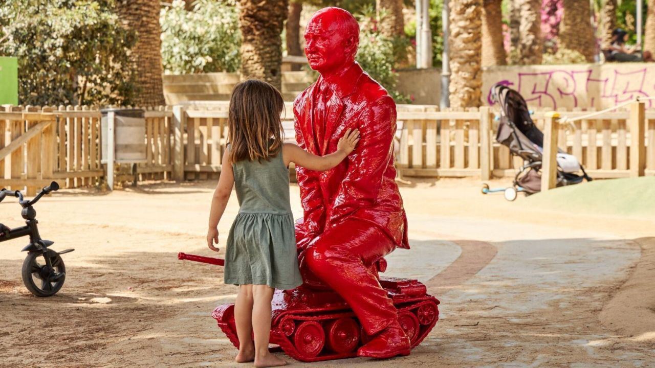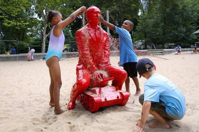 O sculptură de culoarea roșie a lui Vladimir Putin care este așezat pe un tanc a fost instalată pe un teren de joacă din orașul New York.