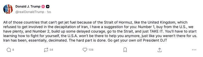 „Toate acele țări care nu pot obține combustibil pentru avioane din cauza Strâmtoarea Ormuz […] cumpărați de la SUA sau mergeți în Strâmtoare și pur și simplu luați-l”, a scris liderul de la Casa Albă.