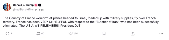 Într-o altă postare, liderul american l-a vizat pe președintele francez, Emmanuel Macron, acuzând Franța că a blocat survolul unor aeronave americane care transportau provizii militare către Israel.