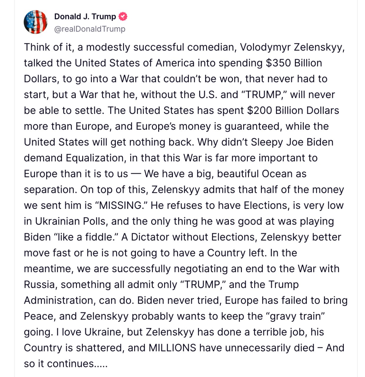 “Un actor de comedie cu succes modest, Volodimir Zelenski a convins SUA să cheltuie 350 de miliarde de dolari pentru a se angaja într-un război care nu putea fi câștigat, care niciodată nu ar fi trebuit să înceapă, dar un război pe care el, fără Statele Unite și TRUMP, nu va putea niciodată să-l soluționeze”, a mai acuzat președintele american.
