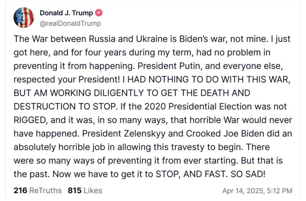 Președintele Statelor Unite, Donald Trump, a declarat că nu are nicio legătură cu declanșarea războiului din Ucraina, susținând că acest conflict este responsabilitatea fostei administrații de la Washington. Într-o postare publicată pe rețeaua sa de socializare, Truth Social, Trump a numit războiul „războiul lui Biden” și a criticat dur atât fostul președinte american, cât și pe liderul ucrainean Volodimir Zelenski.