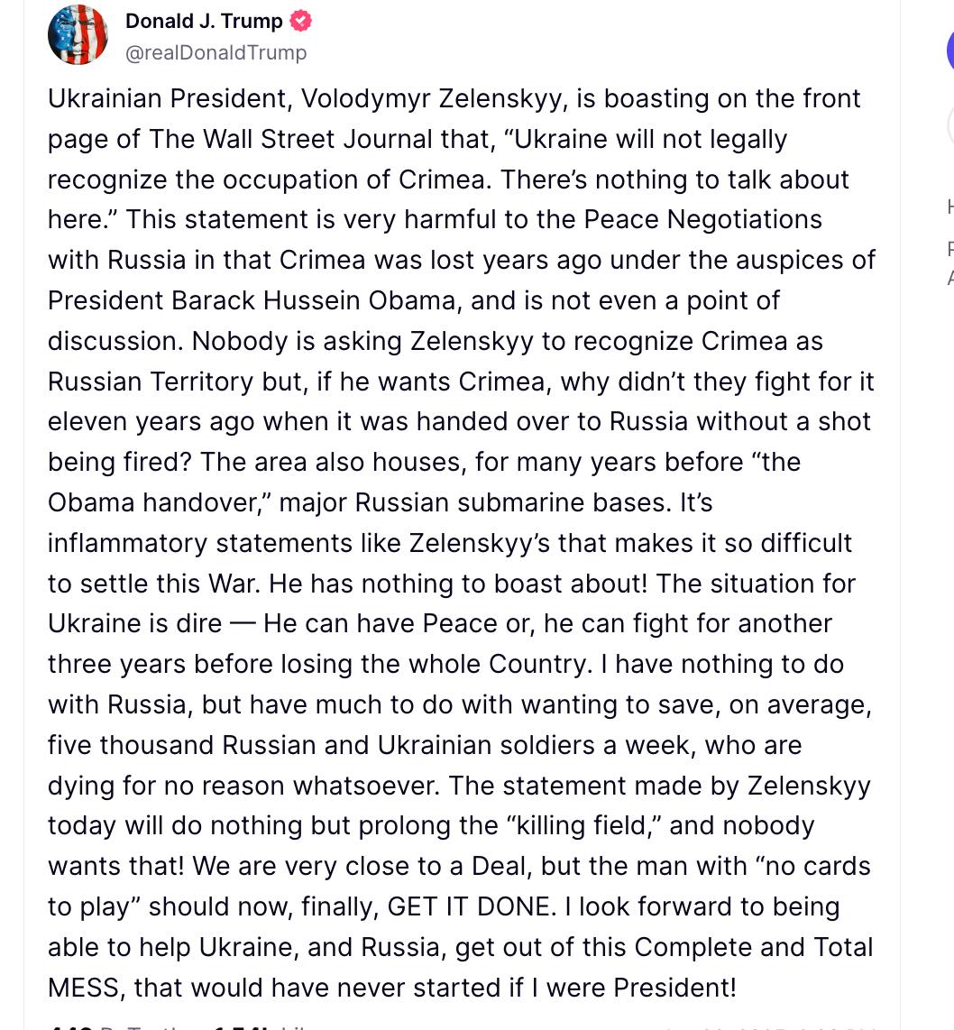 „Zelenski se laudă pe prima pagină a The Wall Street Journal că «Ucraina nu va recunoaște niciodată ocupația Crimeei». Asta nu ajută deloc negocierile de pace. Crimeea a fost pierdută cu ani în urmă, sub administrația lui Barack Hussein Obama, și nici măcar nu mai e un subiect de discuție”, a declarat Trump.
