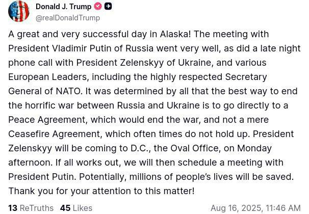 El a adăugat că întâlnirea cu Putin a fost „excelentă și foarte reușită” și a menționat că a discutat telefonic, în cursul nopții, cu Zelenski și mai mulți lideri europeni, inclusiv secretarul general al NATO.