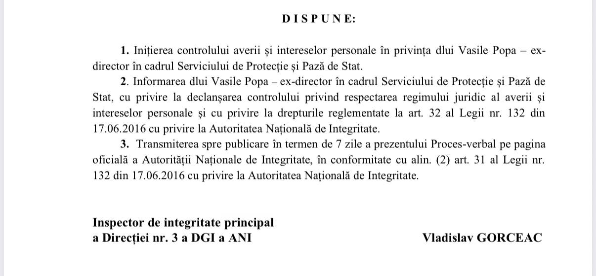 În consecință, în temeiul prevederilor legale, inspectorul de integritate a dispus inițierea controlului averii și intereselor personale în privința lui Vasile Popa. Totodată, acesta urmează să fie informat oficial despre declanșarea procedurii și despre drepturile sale, iar procesul-verbal va fi publicat pe pagina oficială a ANI în termen de șapte zile.
