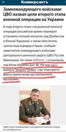General-maiorul Rustam Minekaev, comandant adjunct al Districtului Militar Central al Rusiei susține că în regiunea transnistreanăa Republicii Moldova „este suprimată populația vorbitoare de limbă rusă” și că trebuie salvată.