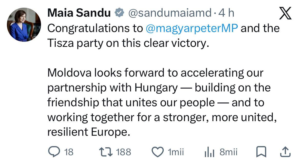 „Felicitări lui Peter Magyar și Tisza pentru această victorie clară. Republica Moldova așteaptă cu interes accelerarea parteneriatului nostru cu Ungaria — bazat pe prietenia care ne unește popoarele — și colaborarea pentru o Europă mai puternică, mai unită și mai rezilientă”, a scris șefa statului pe platforma X.