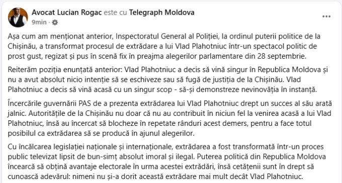 Avocatul lui Vlad Plahotniuc, Lucian Rogac, acuză guvernarea că a folosit procedura de extrădare în scopuri electorale. El a subliniat că „Vlad Plahotniuc a decis să vină singur în Republica Moldova și nu a avut absolut nicio intenție să se eschiveze sau să fugă de justiția de la Chișinău. Vlad Plahotniuc a decis să vină acasă cu un singur scop – să-și demonstreze nevinovăția în instanță”, scrie Telegraph.md.