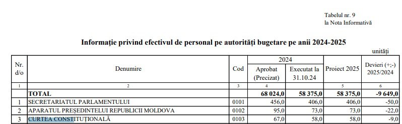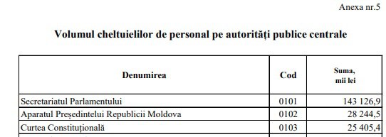 Documentul votat în prima lectură de majoritatea parlamentară, la doar o zi după ce a fost aprobat de Guvern, prevede că din cele 35 de milioane 537,4 mii de lei, 25,4 milioane de lei sau mai mult de 70 la sută reprezintă salariile. Ținând cont de faptul numărul angajaților Curții Constituționale este de 58, constatăm că salariul mediu lunar în această instituție este de 36.500 de lei.