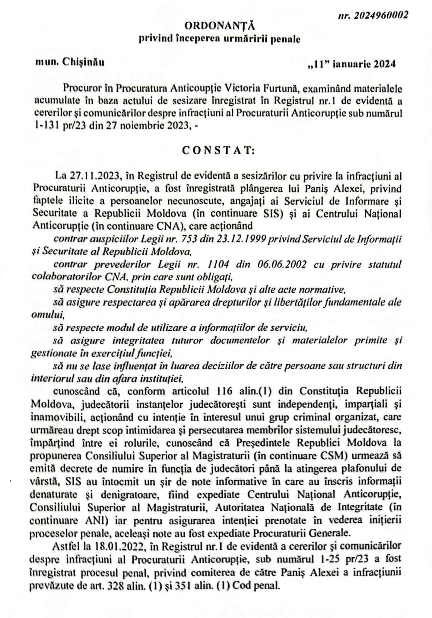 În martie 2024, Victoria Furtună declara că Serviciul de Informații și Securitate a cerut investigarea judecătorului Alexei Paniș, iar Procuratura a verificat și emis ordonanțe de refuz. Totuși, CNA a expediat Aparatului președintelui țării „o notă pe care o secretizează”.