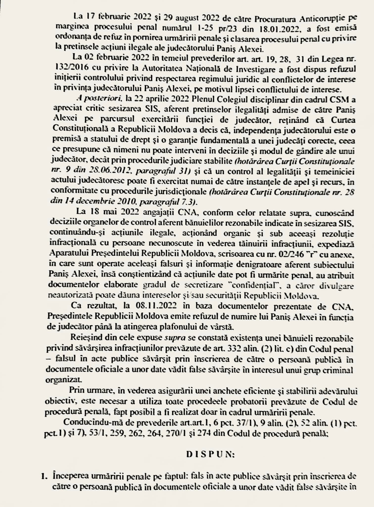 “Avem motiv de sărbătoare. Împlinim 1 an de zile de la pornirea urmăririi penale la plângerea mea. Procurorii încă nu au găsit cine totuși din CNA a falsificat acte și prezentat informație falsă la președinție (ocupați cu vetting…). Dacă totuși informația prezentată de CNA era veridică , am impresia că informația din actul de refuz de numire la plafon este falsă…но это совсем другая история…pas cu pas o să aflăm…cenzura dispare și numai cenzura…”, a scris Alexei Paniș pe Facebook, publicând și Ordonanța privind începerea urmăririi penale semnată de fostul procuror anticorupție, Victoria Furtună.