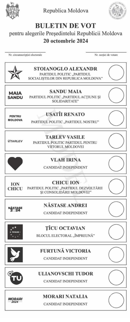 Totodată, CEC a aprobat modelul și textul buletinului de vot pentru alegerile Președintelui Republicii Moldova din 20 octombrie 2024. Acesta se va tipări pe hârtie opacă (mată) de culoare gri afumat pentru turul I și pentru turul II se va tipări pe hârtie opacă (mată) de culoare albastră oțel. Concurenții electorali se vor înscrie în buletin conform ordinii stabilite.
