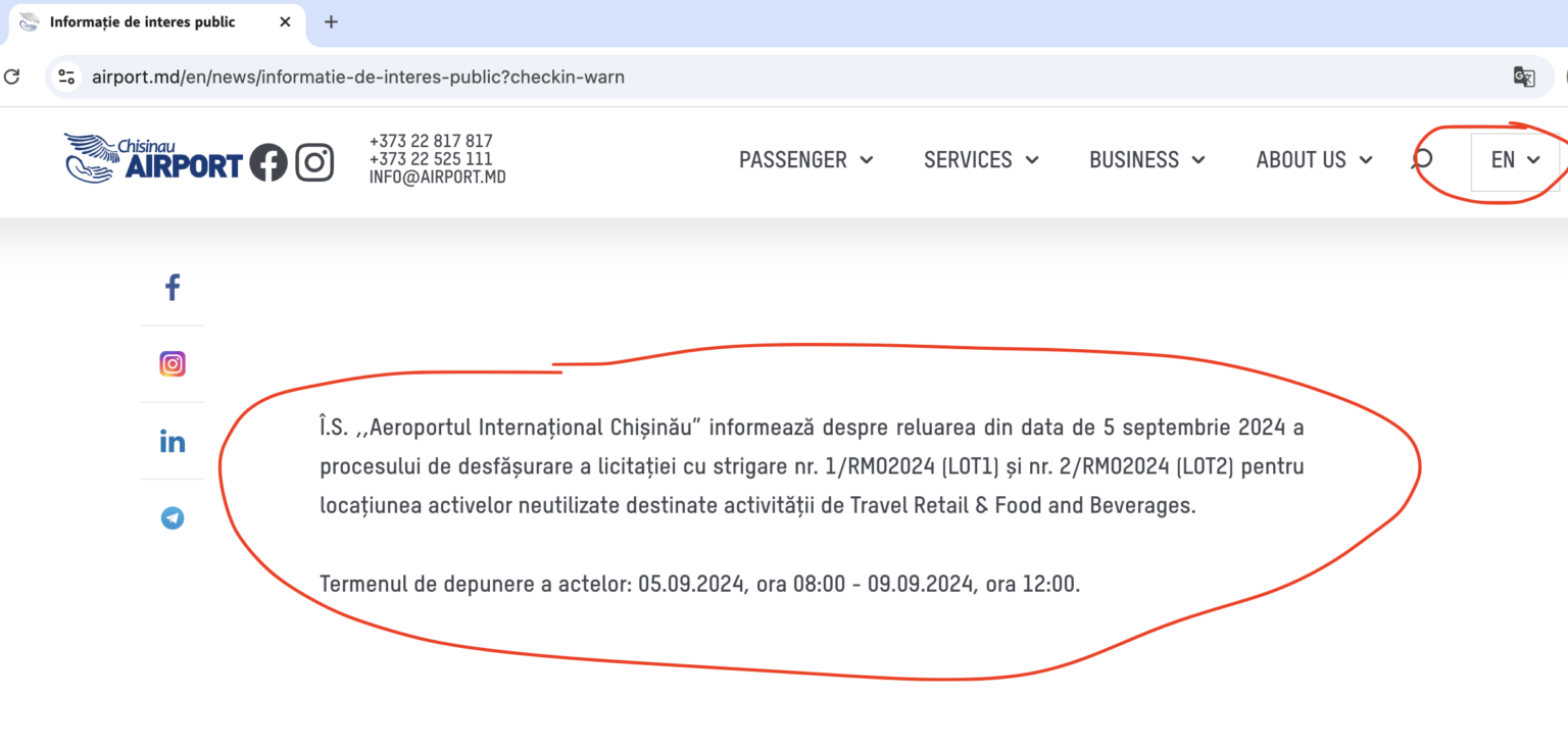 Aeroportul s-a limitat la un anunț publicat pe site-ul oficial și pe canalul de Telegram, publicat pe data 15 august, redactat doar în limba română, în care a fost menționată reluarea licitației și perioada de depunere a documentelor.