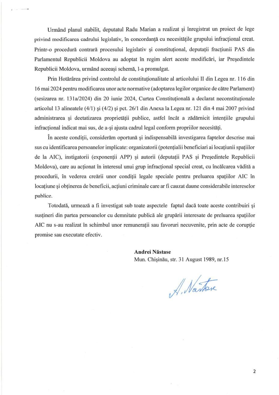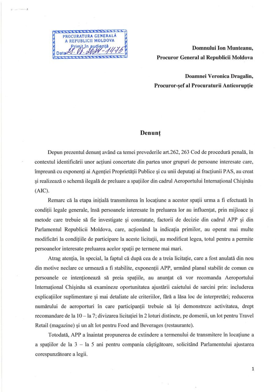 Liderul protestelor antioligarhice, Andrei Năstase, a depus astăzi o plângere la Procuratura Generală și Procuratura Anticorupție prin care cere investigarea „schemelor ilegale de influențare a procesului de atribuire a spațiilor comerciale din incinta Aeroportului Internațional Chișinău, inclusiv prin prisma constituirii unui grup infracțional organizat, compus din membri ai Guvernului, ai Agenției Proprietății Publice și deputați PAS”.