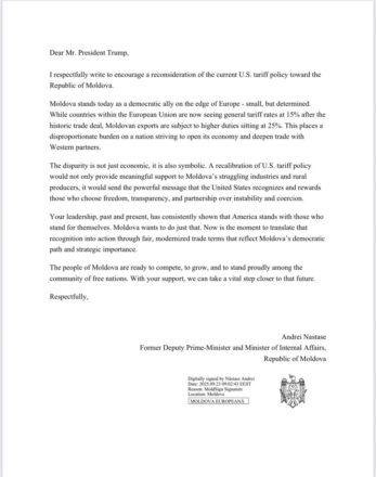 În mesajul adresat liderului de la Casa Albă, Năstase a subliniat că tarifele impuse Republicii Moldova sunt cu 10% mai mari decât cele aplicate partenerilor europeni – 25% față de 15% – fapt care afectează direct micii producători și industriile emergente.