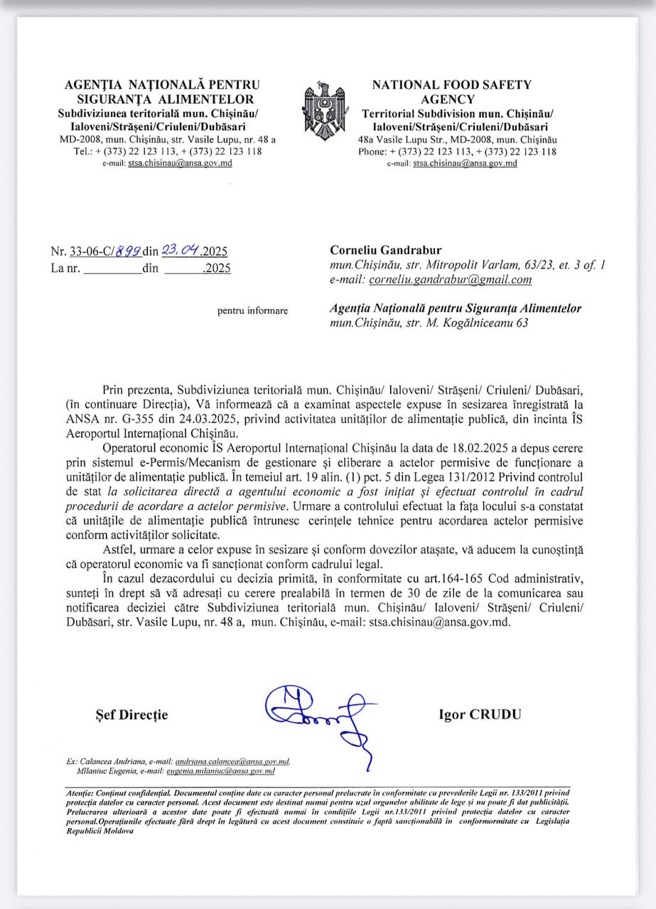 După luni în care autoritățile păreau să nu „găsească probe” privind activitatea ilegală de la Aeroportul Internațional Chișinău (AIC), Agenția Națională pentru Siguranța Alimentelor (ANSA) a confirmat, în sfârșit, că legea a fost încălcată. Potrivit răspunsului oficial al instituției oferit Agenției de Presă Telegraph, se recunoaște că responsabilii AIC, printre care Spoială și Cojuhari, nu au respectat normele legale, iar aeroportul urmează a fi sancționat.