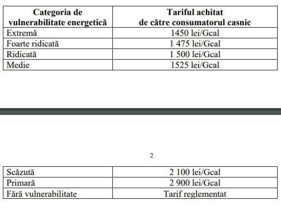 Tariful la energie termică va fi compensat în medie cu 58%. Consumatorii din categoria de vulnerabilitate extremă vor plăti 1450 lei/Gcal, iar cei din categoria de vulnerabilitate primară – 2900 lei/Gcal, în condițiile unui tarif de 3467 lei/Gcal. Plafonul compensat lunar fiind de 1,3 gigacalorii.