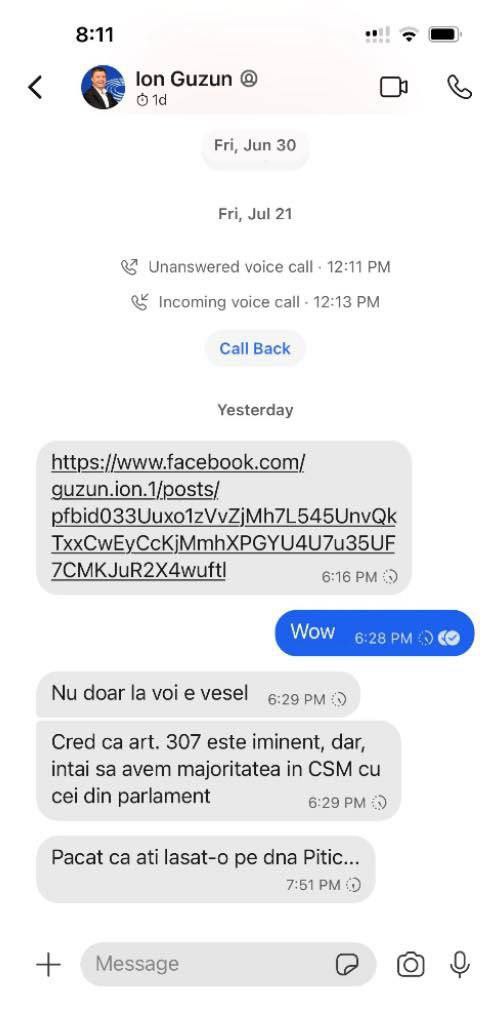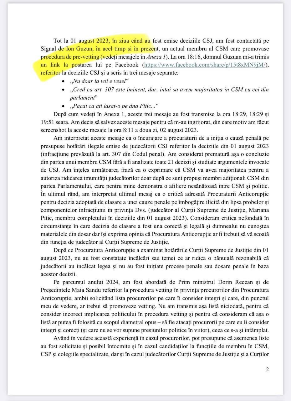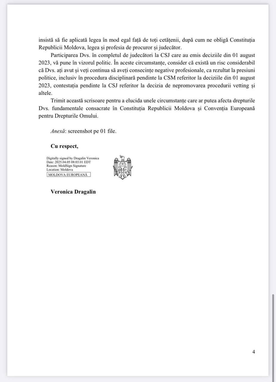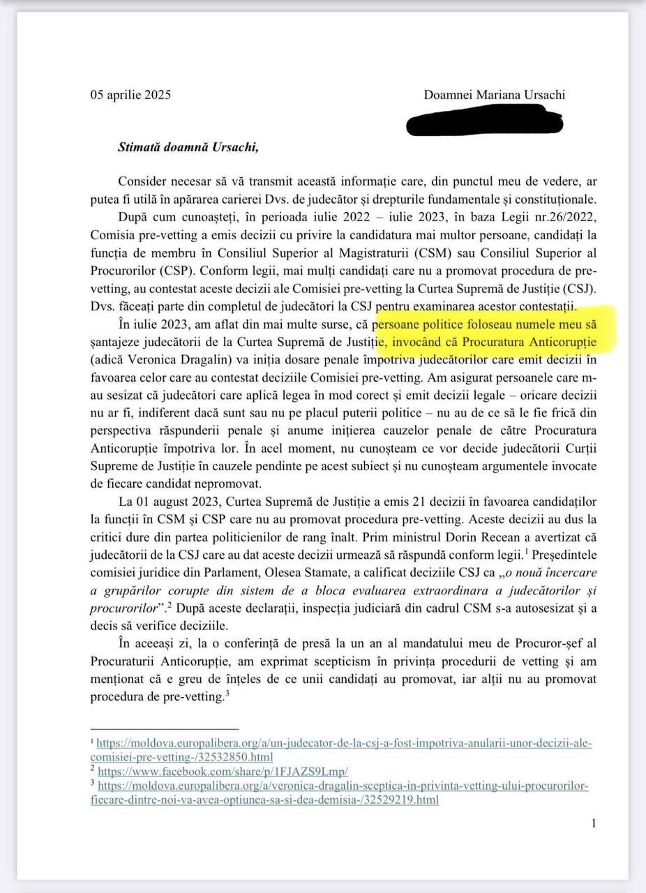 Scrisoarea, prezentată de avocata Cristina Ciubotaru, scoate la iveală posibile imixtiuni politice directe în procesul de evaluare a procurorilor și judecătorilor. Potrivit documentului, membrul CSM Ion Guzun i-ar fi transmis Veronicăi Dragalin că majoritatea „ascultătoare” din Consiliu va fi asigurată de Parlament.