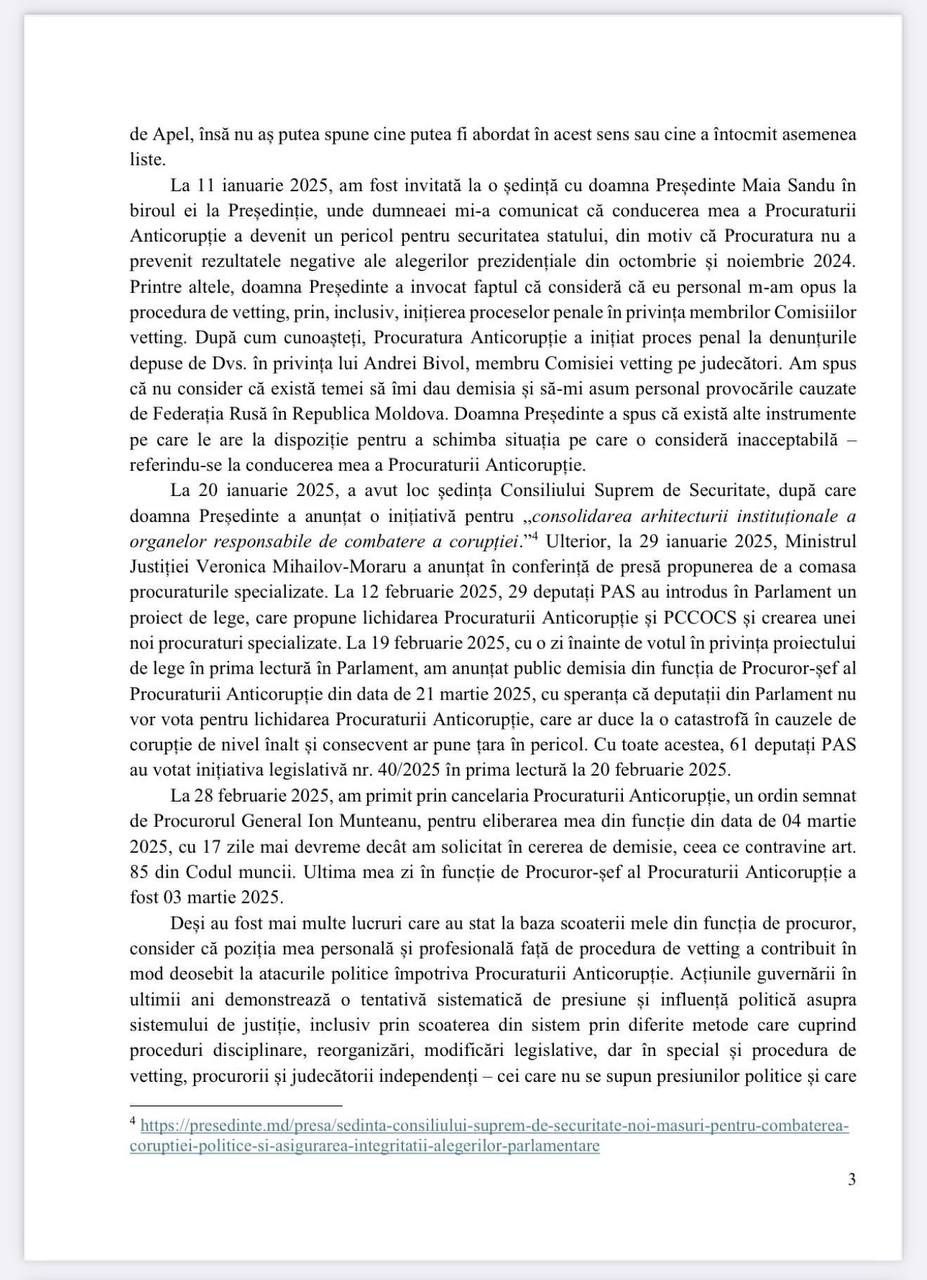 „La 11 ianuarie 2025, am fost invitată la o ședință cu doamna Președinte Maia Sandu în biroul ei la Președinție, unde dumneaei mi-a comunicat că conducerea mea a Procuraturii Anticorupție a devenit un pericol pentru securitatea statului, din motiv că Procuratura nu a prevenit rezultatele negative ale alegerilor prezidențiale din octombrie și noiembrie 2024. […] Doamna Președinte a spus că există alte instrumente pe care le are la dispoziție pentru a schimba situația pe care o consideră inacceptabilă – referindu-se la conducerea mea a Procuraturii Anticorupție.”