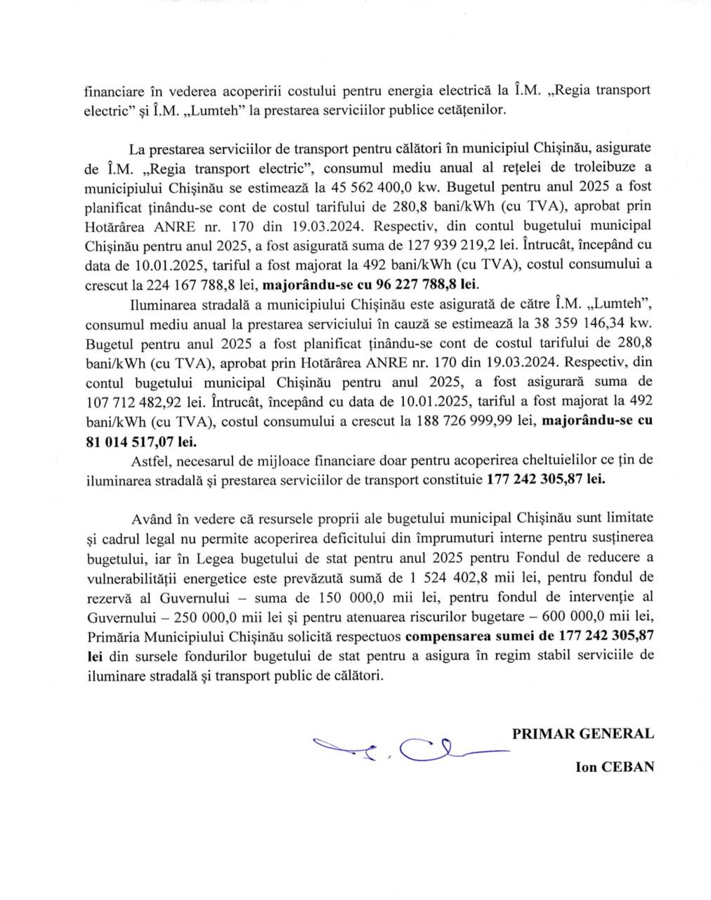 „Primăria Municipiului Chișinău a transmis către instituțiile statului, și anume: Președinția, Parlamentul, Guvernul, Cancelaria de Stat și Ministerul Finanțelor, o solicitare de compensare din sursele bugetului de stat pentru unele servicii strategice, precum transportul public de călători și iluminatul public, iar suma solicitată este de peste 177 de milioane de lei”, a subliniat edilul.