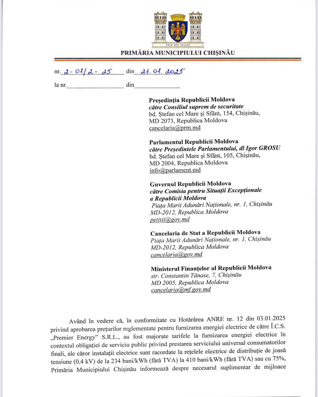 „Municipalitatea nu a planificat aceste cheltuieli, ținând cont că prețul la energia electrică a crescut cu 75%. Sunteți direct responsabili de situația actuală”, a mai transmis Primarul General celor din fruntea țării.