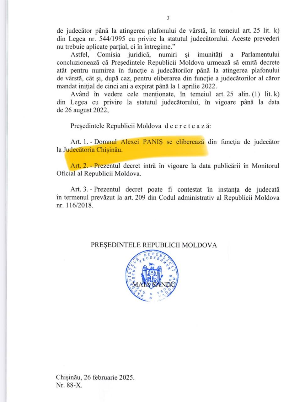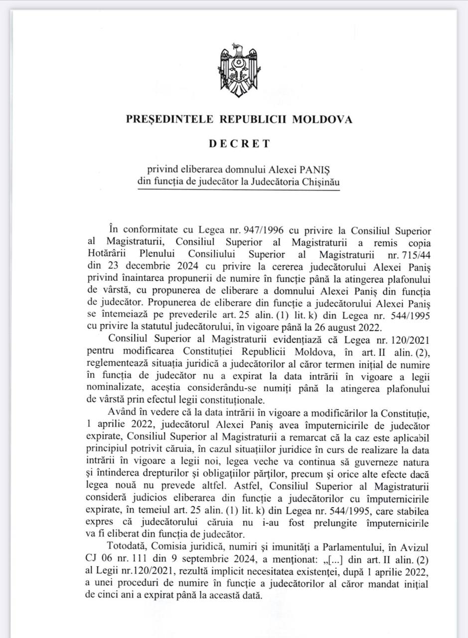 La sfârșitul lunii decembrie Consiliul Superior al Magistraturii a respins, cu șase voturi pro și patru împotrivă, cererea judecătorului Alexei Paniș din cadrul Judecătoriei Chișinău privind înaintarea propunerii repetate Președintelui Republicii Moldova de numire în funcție până la atingerea plafonului de vârstă.