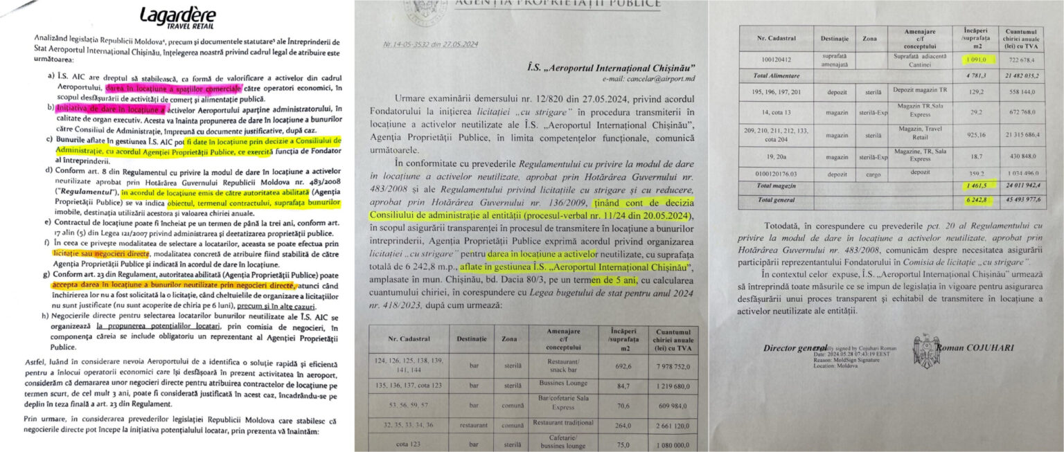 Compania franceză „Lagardere”, favorita câștigării licitației spațiilor comerciale de la aeroport a transmis, în anul 2023, cu mult înainte de demararea concursului, o scrisoare autorităților în care explica, pe puncte, cum poate fi organizată licitația de la aeroport. Documentul a fost publicat de către bloggerul Eugen Luchianiuc pe blogul său.