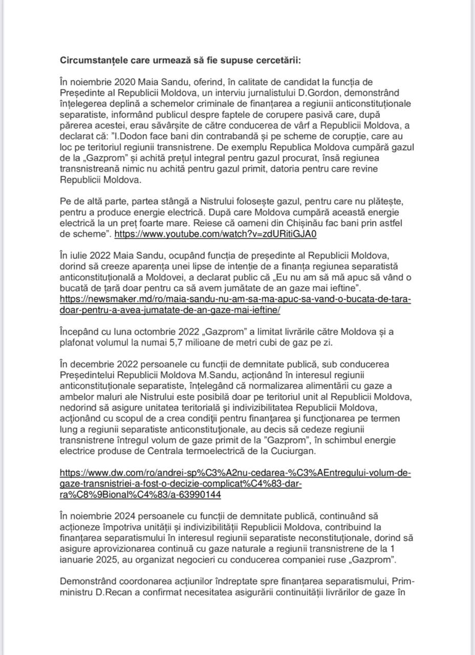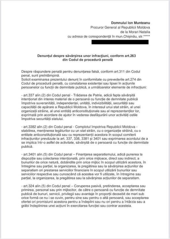 (DOC) Natalia Morari, denunț la Procuratură Generală pentru susținerea separatismului din regiunea transnistreană de către PAS