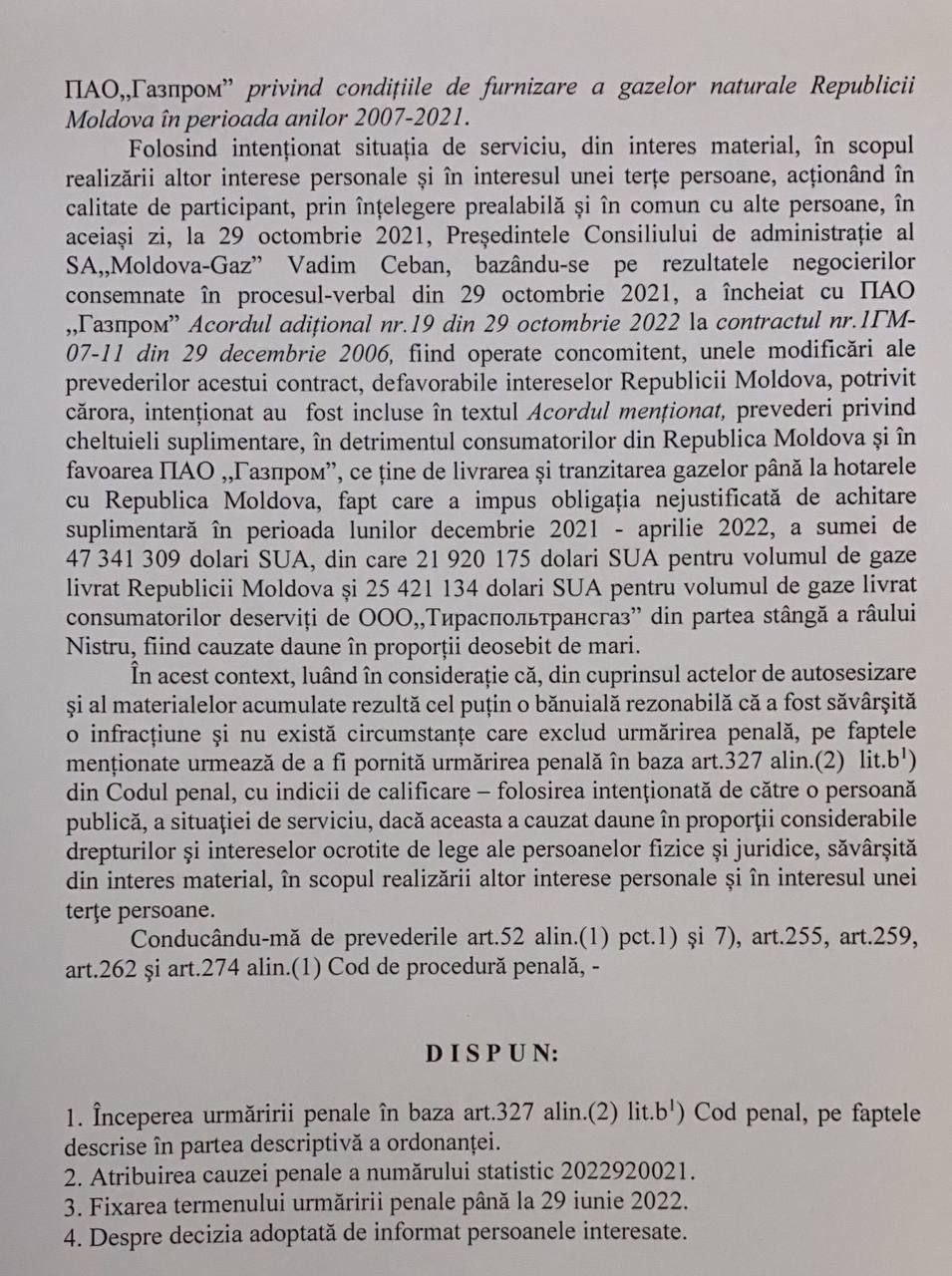 Numărul cauzei penale este 2022920020 și a fost pornită în luna mai 2022, în baza art. 327 Cod penal – abuz de serviciu, conform sursei. Ancheta a fost inițiată de procurorul Ghenadie Pîrlii, „pe faptul încălcărilor comise în procesul negocierilor, manifestate prin acceptarea și includerea de către persoane publice și alte persoane, prin abuz de serviciu, a unor condiții și clauze în detrimentul intereselor Republicii Moldova, soldate cu daune în proporții considerabile”.