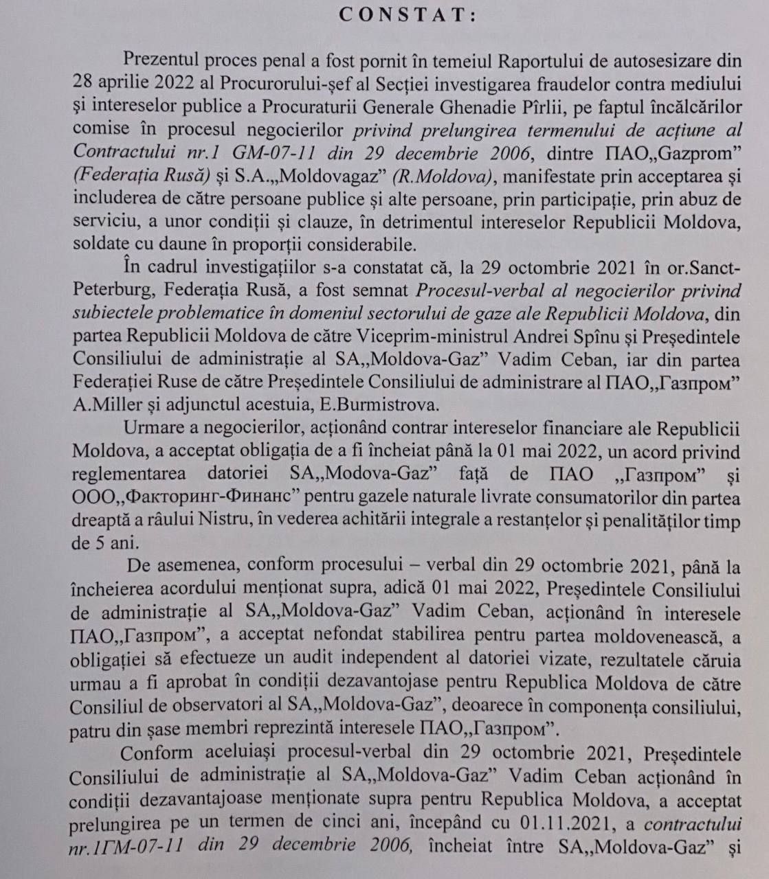 (DOC) Negocierea contractului cu Gazprom, făcută de Andrei Spînu, sub lupa procurorilor. Ordonanța a fost făcută publică