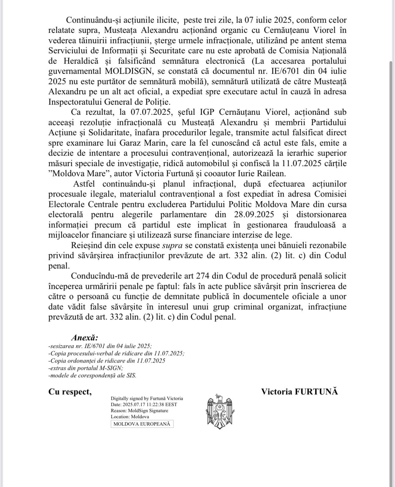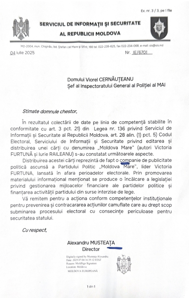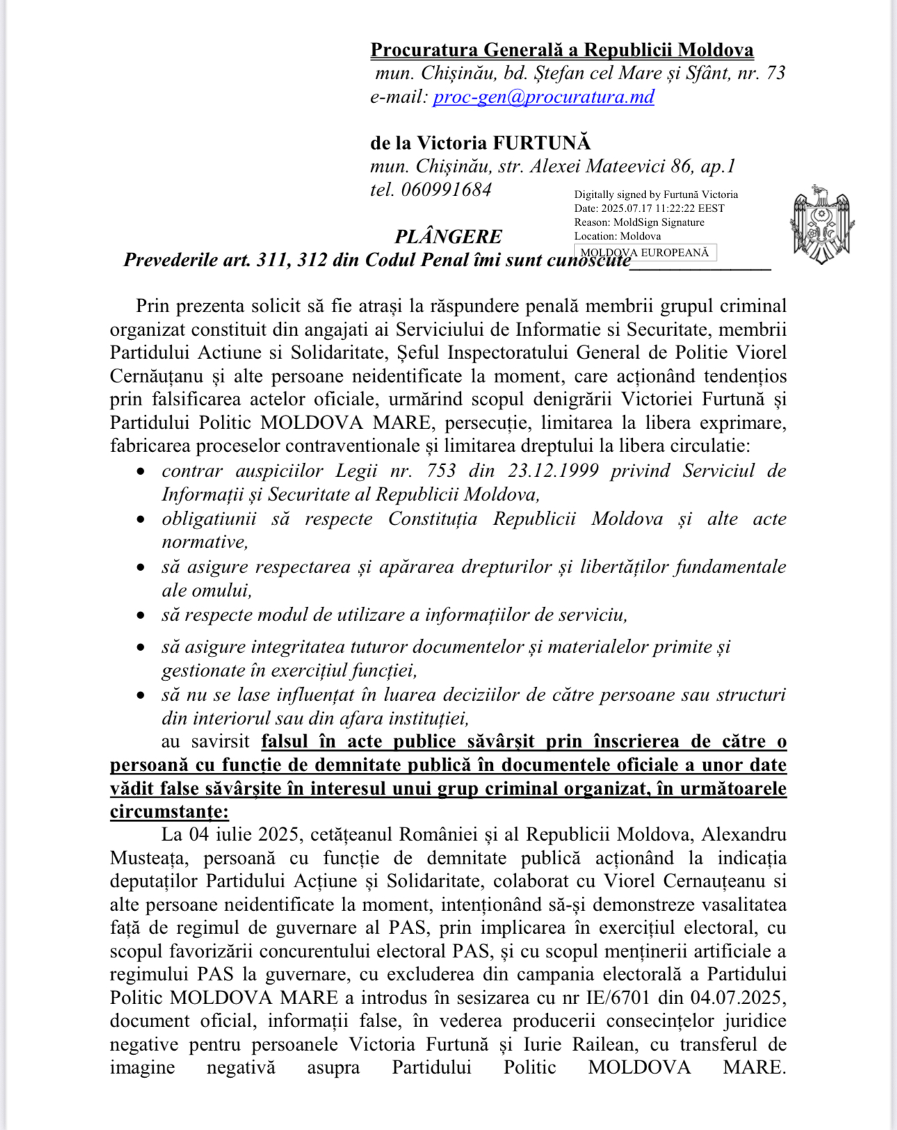 Potrivit plângerii, șeful SIS Alexandru Musteață, la indicația deputaților PAS și în complicitate cu șeful IGP Viorel Cernăuțanu, ar fi falsificat un document care conține informații false menite să compromită autorii cărții „Moldova Mare” – Victoria Furtună și Iurie Răileanu. La data de 7 iulie 2025, acest document fals a fost transmis Poliției, iar apoi Cernăuțanu l-a redirecționat inspectorului Marin Garaz, care a inițiat un proces contravențional. Ca urmare, au fost aplicate măsuri speciale de supraveghere, a fost confiscat automobilul și 50 de exemplare ale cărții „Moldova Mare”.