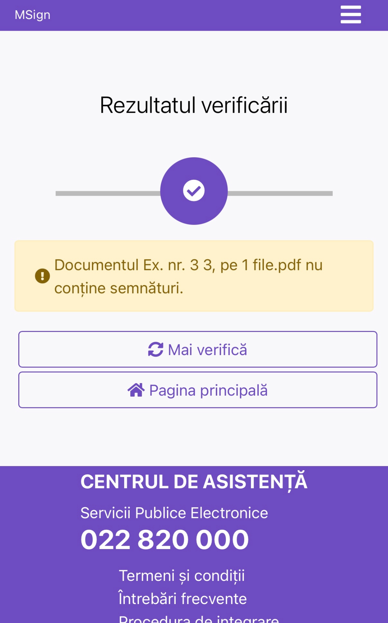 O altă dovadă a falsificării este rezultatul verificării prin sistemul M-Sign. S-a constatat că un astfel de document nu există în Registrul documentelor electronice. Cu alte cuvinte, din punct de vedere legal, documentul nu există, ceea ce înseamnă că semnătura electronică aplicată este falsă.