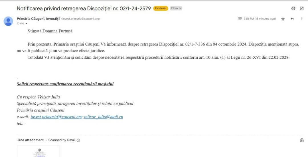Furtună a explicat că pe 4 octombrie 2024, la ora 10:07, Primăria orașului Căușeni a aprobat solicitarea depusă în conformitate cu legea, iar dispoziția a fost transmisă organelor competente. Cu toate acestea, la doar câteva ore distanță, la 15:56, a fost informată că dispoziția a fost retrasă, fără să fie oferite detalii referitoare la motivele acestei decizii.