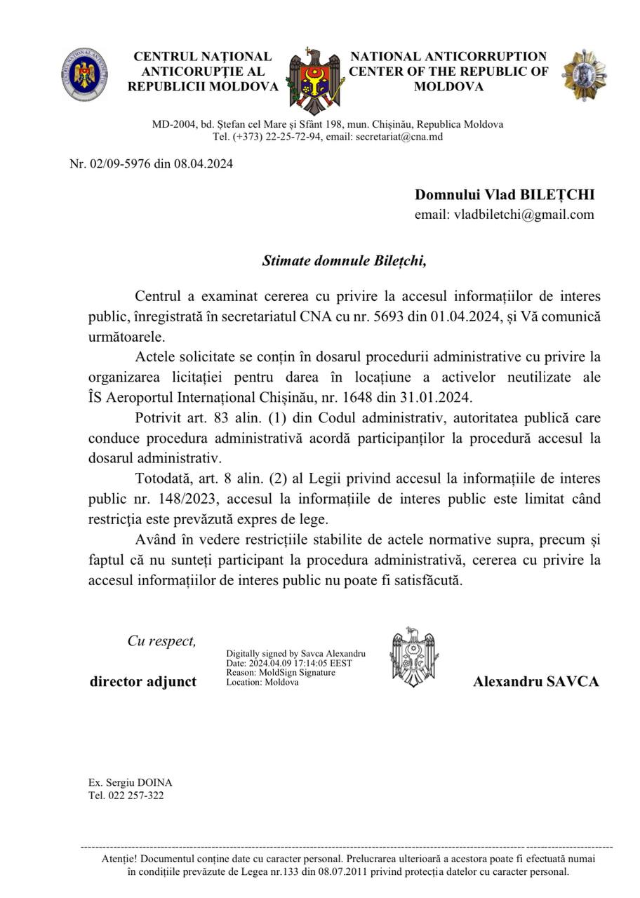 (DOC) Vlad Bilețchi: „CNA confirmă încă odată existența dosarului privind licitația de la Aeroport și spune că toate informațiile pe care le solicităm noi se află în acest dosar”
