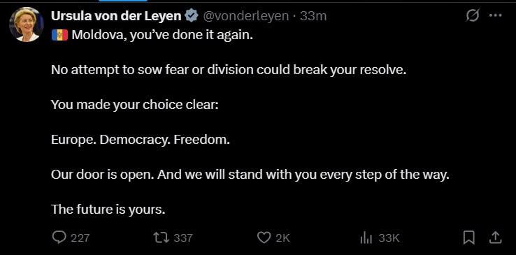 „V-ați exprimat alegerea clar: Europa. Democrație. Libertate. Ușa noastră este deschisă. Și vom fi alături de voi la fiecare pas. Viitorul este al vostru.”