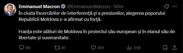 „În ciuda încercărilor de interferență și a presiunilor, alegerea poporului Republicii Moldova s-a afirmat cu forță. Franța este alături de Republica Moldova în proiectul său european și în elanul său de libertate și suveranitate.”
