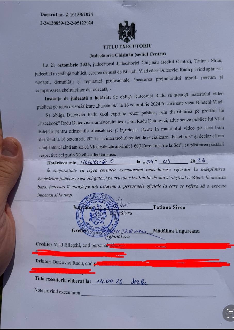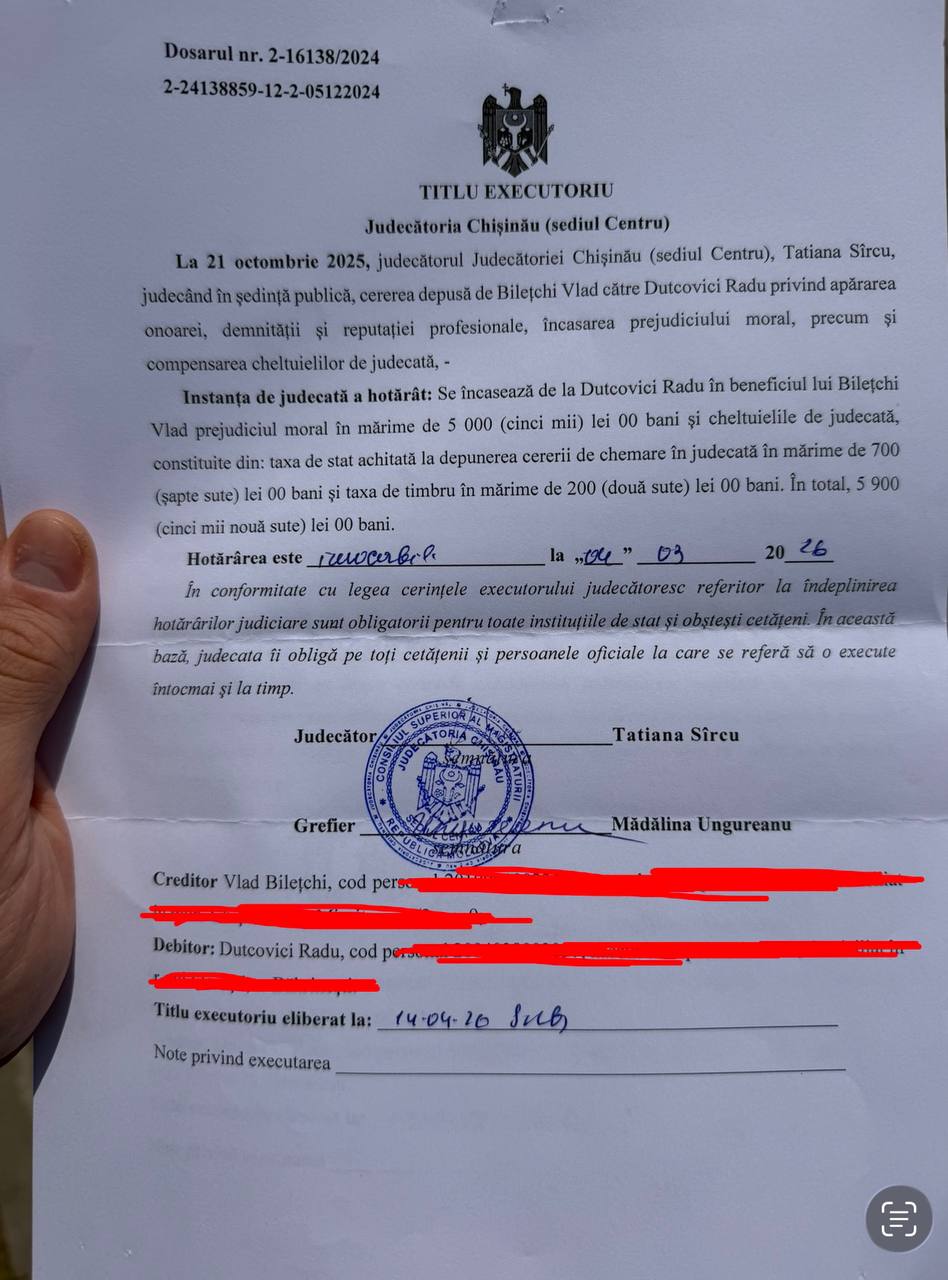 Activistul civic Vlad Bilețchi a trecut la etapa executării silite a hotărârii judecătorești obținute împotriva lui Radu Dutcovici, după ce a înaintat decizia instanței către executorul judecătoresc.
