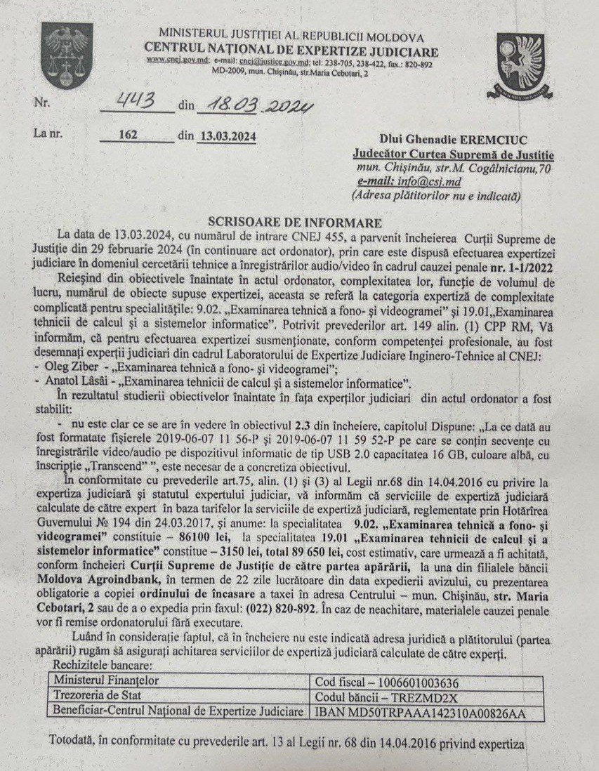 CNEJ mai indică că examinarea tehnică a fono și vedeogramei constituie 86.100 de lei, iar examinarea tehnicii de calcul și sistemelor informatice constituie 3.150 de lei, în total costul expertizei fiind 89.650 de lei. Banii vor fi achitați, conform CNEJ, de partea apărării fostului președinte al R. Moldova. CNEJ mai precizează că, începerea expertizei va începe în martie 2025.