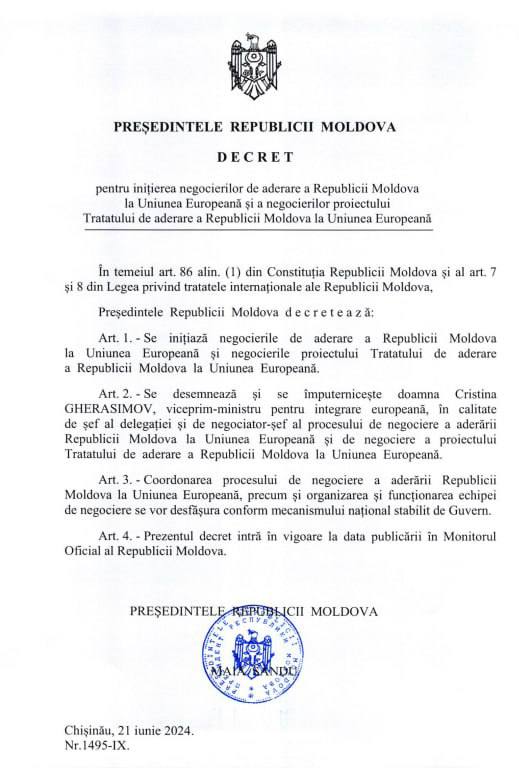 Președinta Maia Sandu a semnat astăzi Decretul privind inițierea negocierilor de aderare a Republicii Moldova la Uniunea Europeană. De asemenea, la ședința Comisiei Naționale pentru Integrare Europeană, a fost discutată poziția generală de negocieri, ce urmează a fi aprobată de Guvern, fiind desemnată în acest sens Cristina Gherasimov, Viceprim-ministră pentru Integrare Europeană, în calitate de negociator-șef din partea Republicii Moldova.
